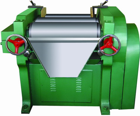 三輥研磨機是通過水平方向排列的三根輥筒不等速旋轉(zhuǎn)相互擠壓,使得相鄰軋輥產(chǎn)生強烈剪切力,從而磨擦、剪切,完成對漿料的研磨。